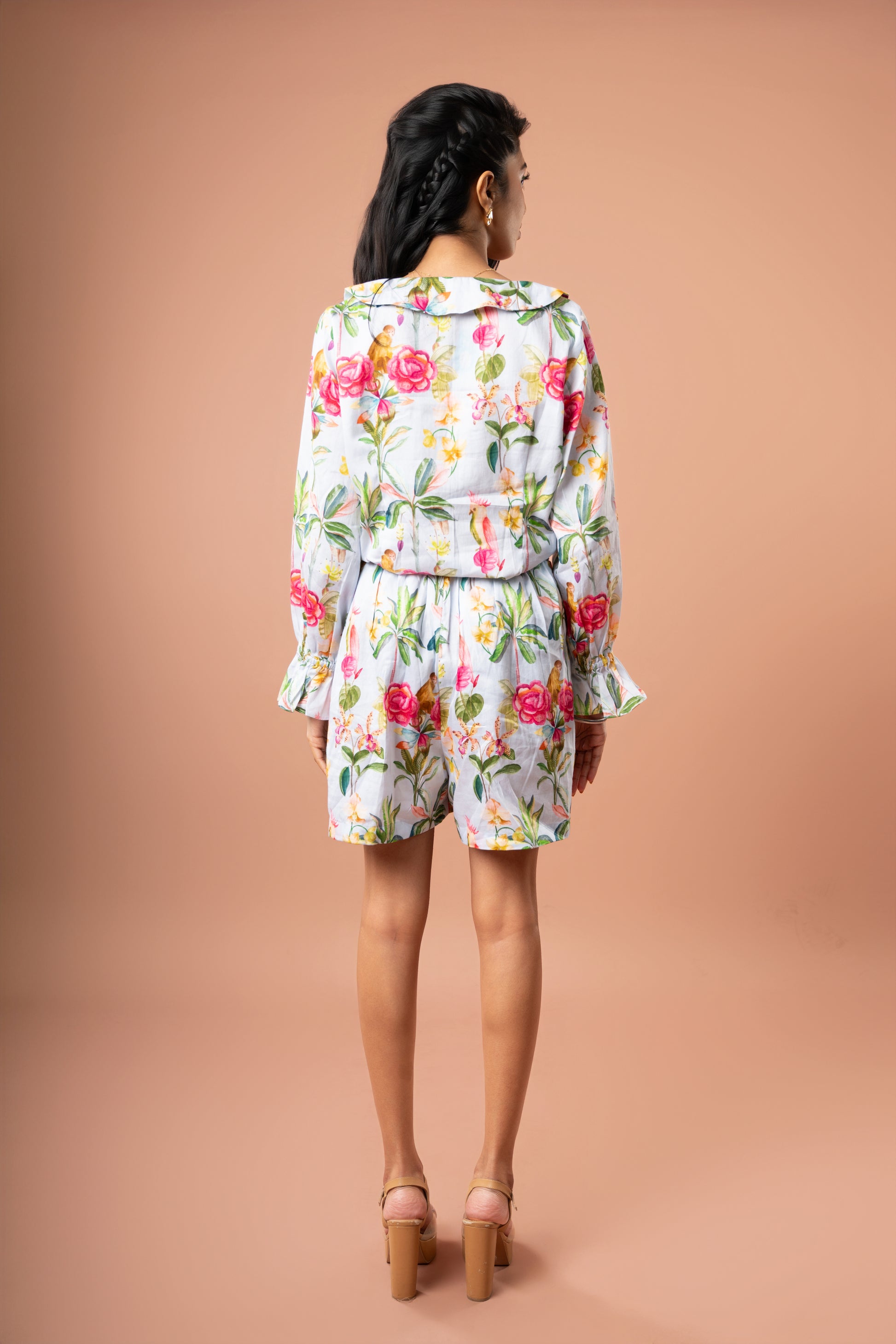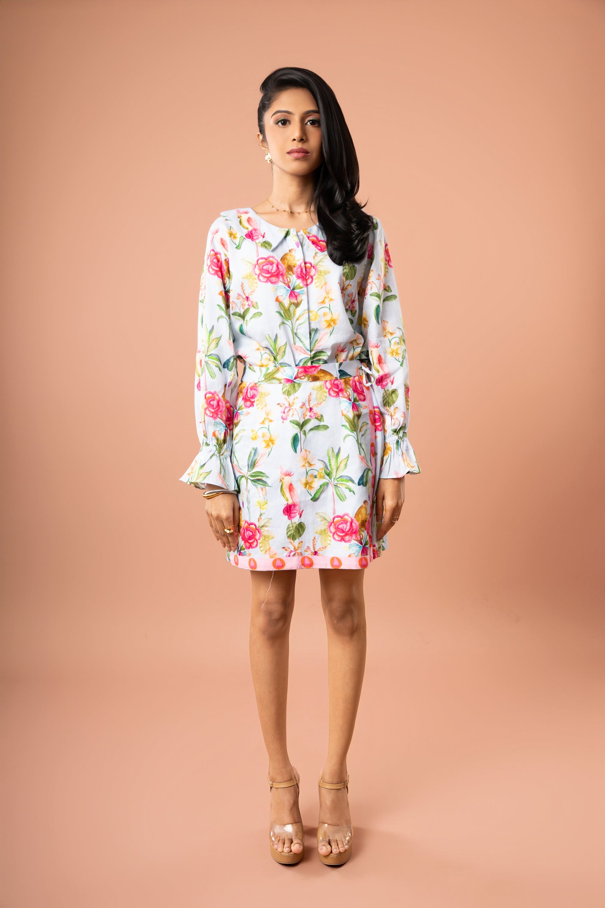 This sky blue cotton satin co-ord set is equal parts cute and chic! It features a collared full-sleeve shirt with playful frill detailing and a flattering tie-up skort for that perfect blend of structure and ease. Finished with our signature heart border for a dash of quirk. It’s a look that says put-together but make it fun!