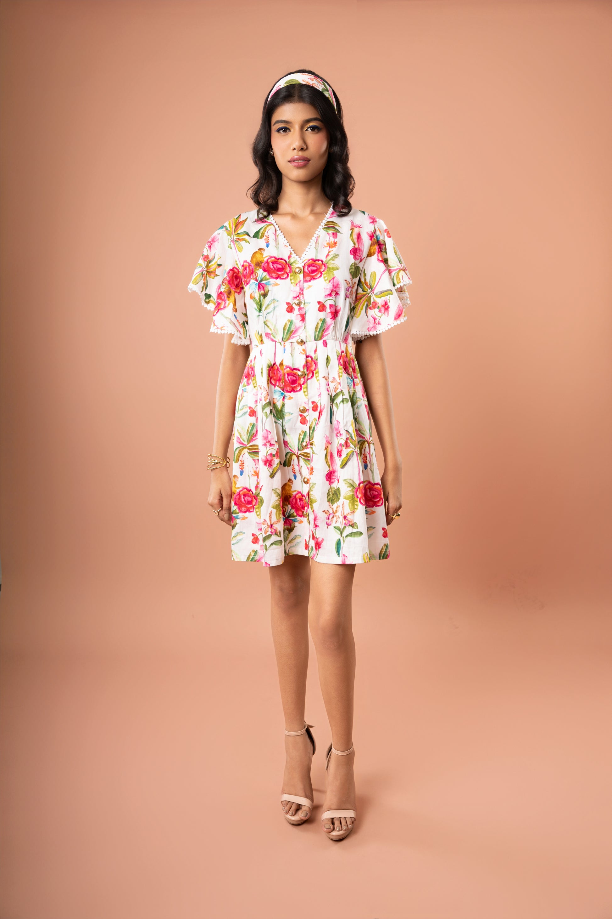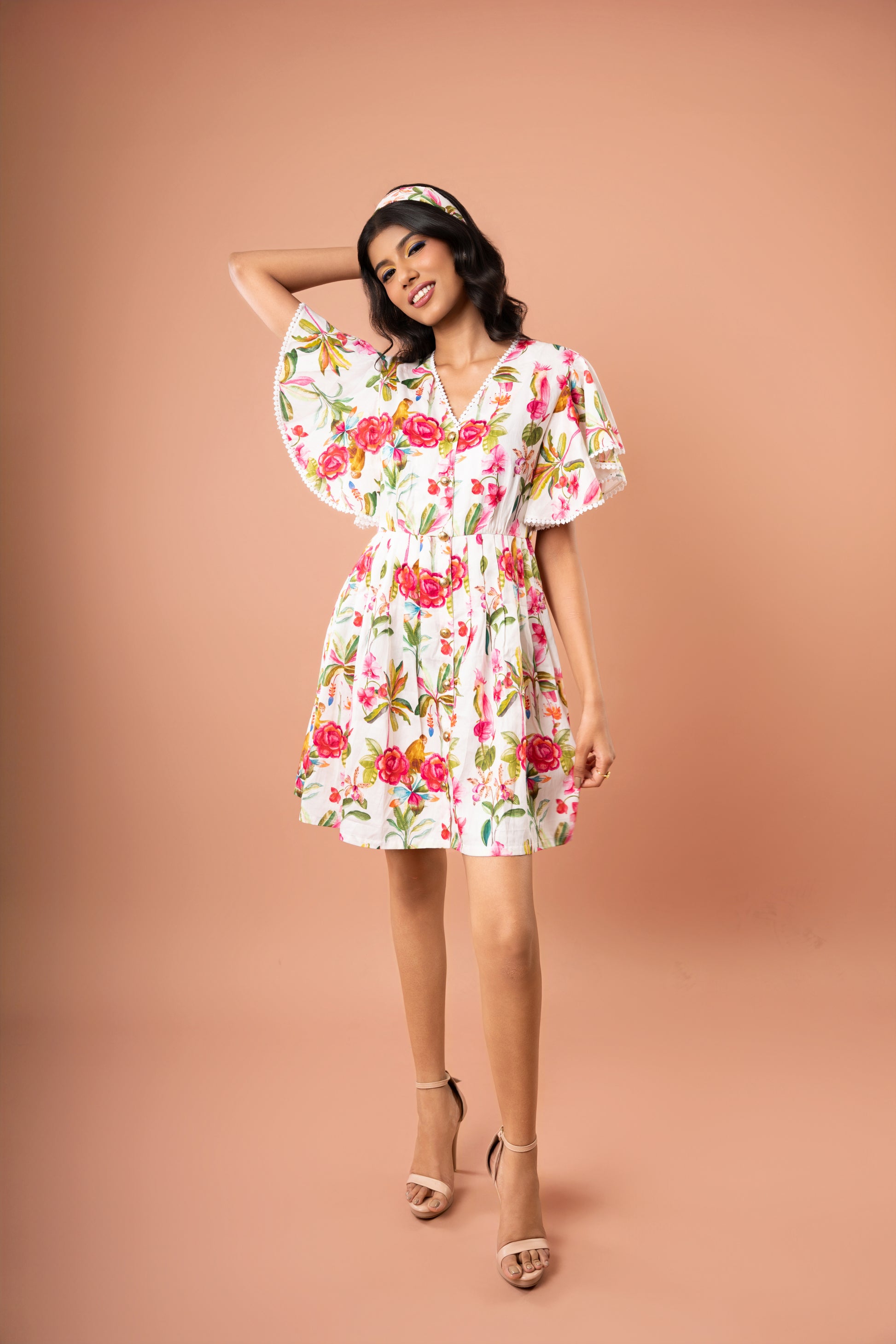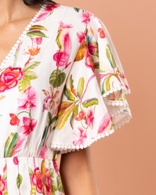 This cotton satin stunner features flared sleeves with delicate pleats and charming crochet lace detailing on the neckline and sleeve edges. Soft, breezy, and irresistibly romantic. This outfit is made for twirling into sunshine.