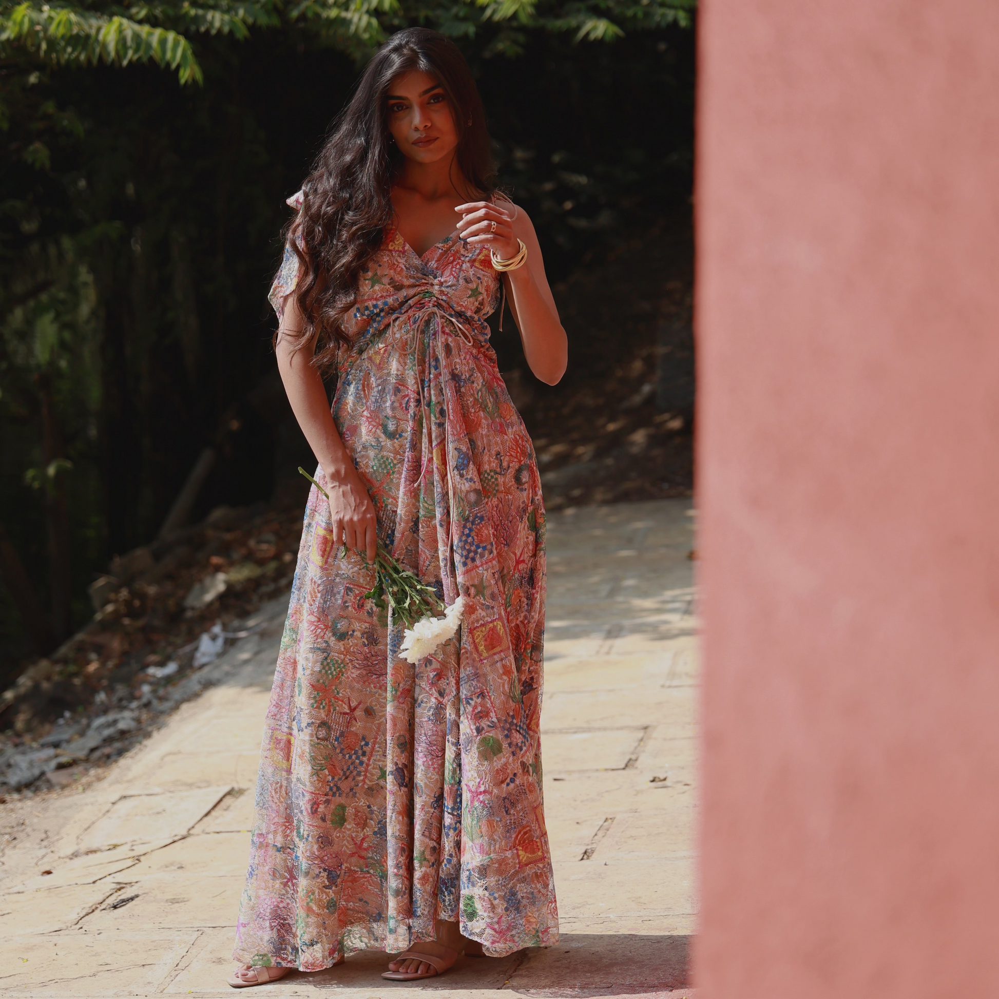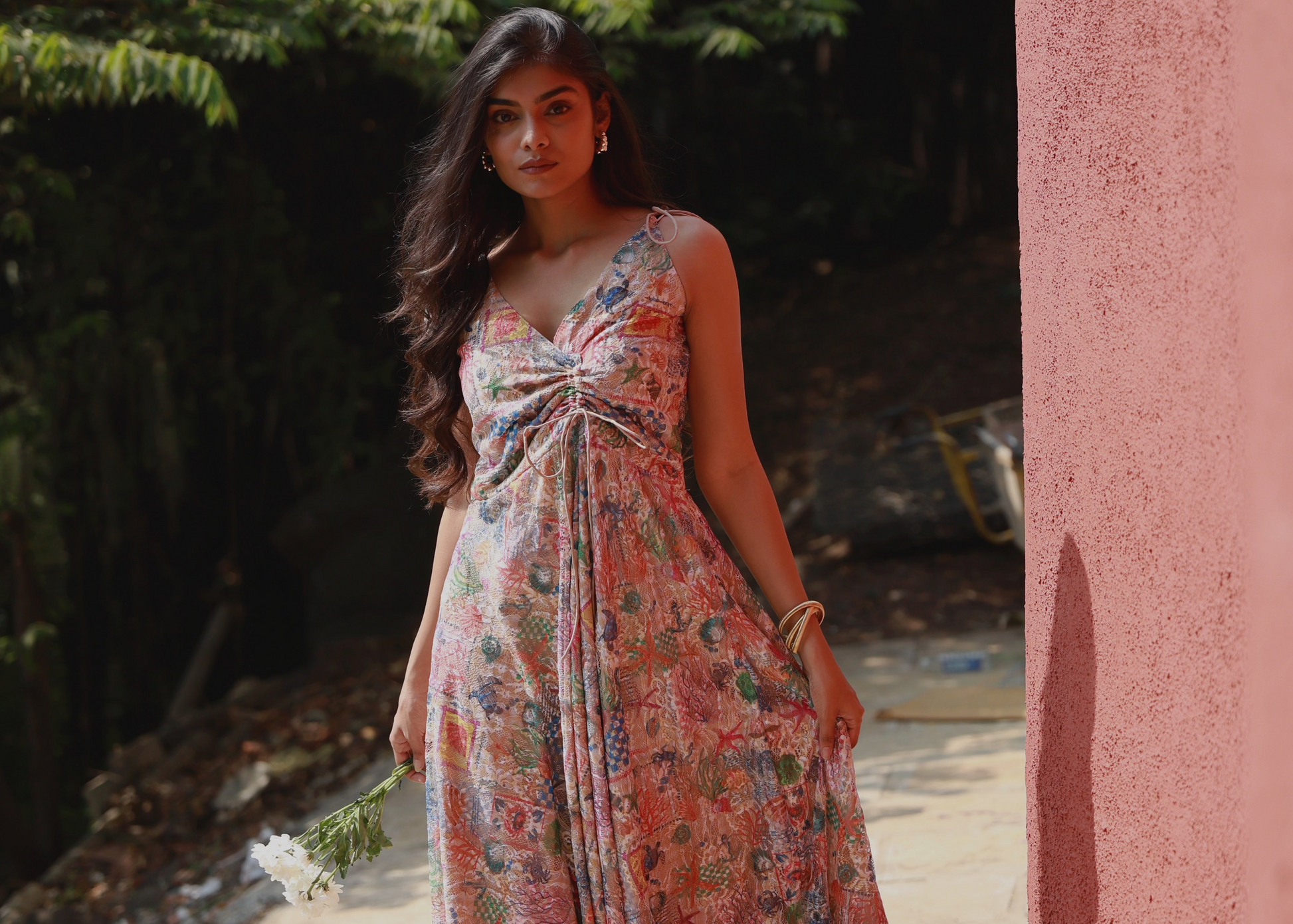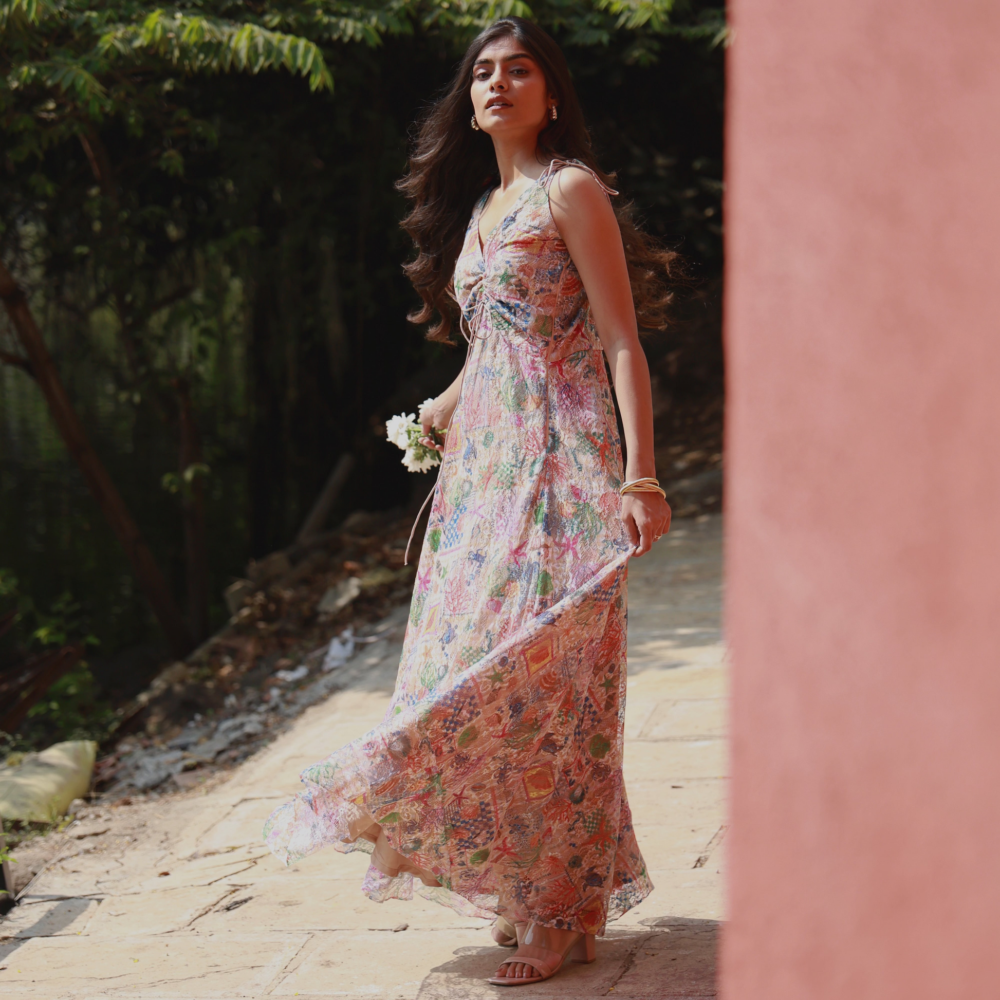A dreamy printed chantilly lace-up dress featuring a soft pull-up style yoke and delicate tie-up detailing. Designed with a beautifully flowing silhouette. Effortless, feminine, and perfect for any mood or moment.