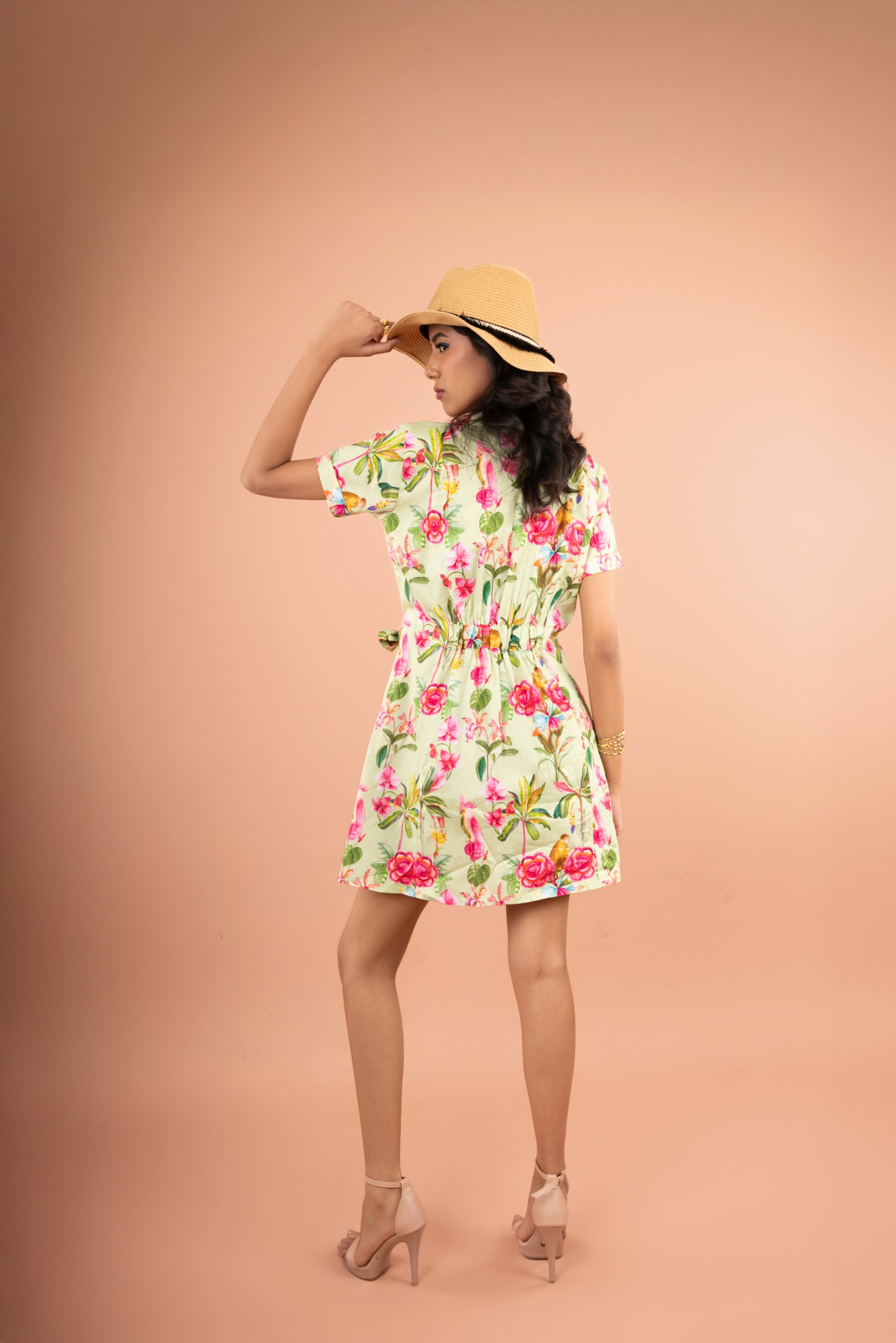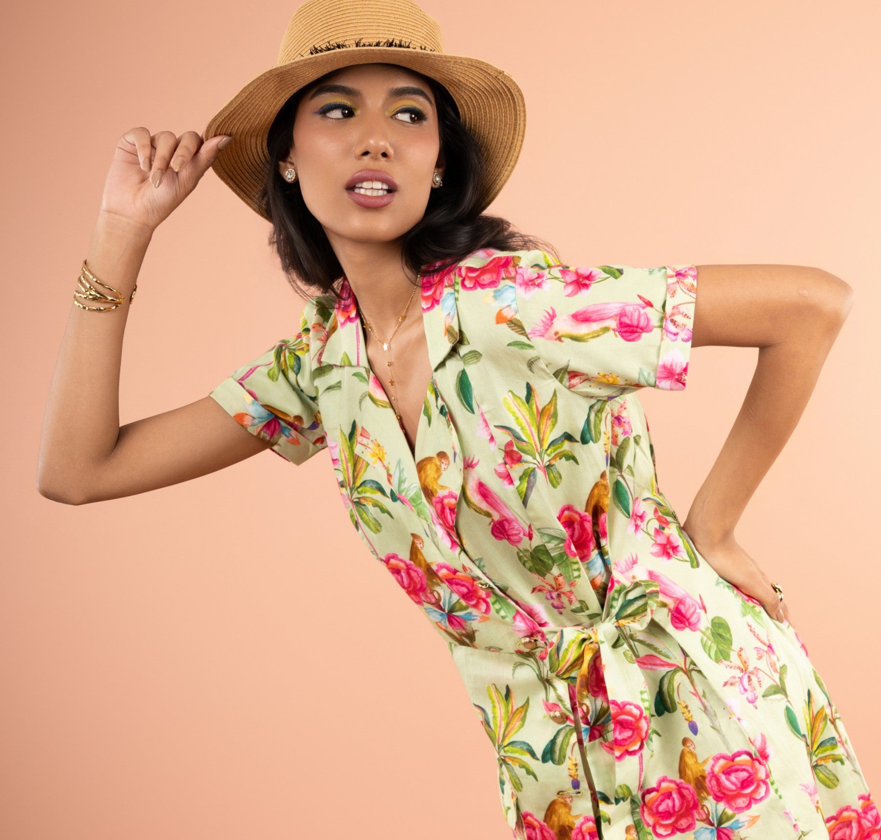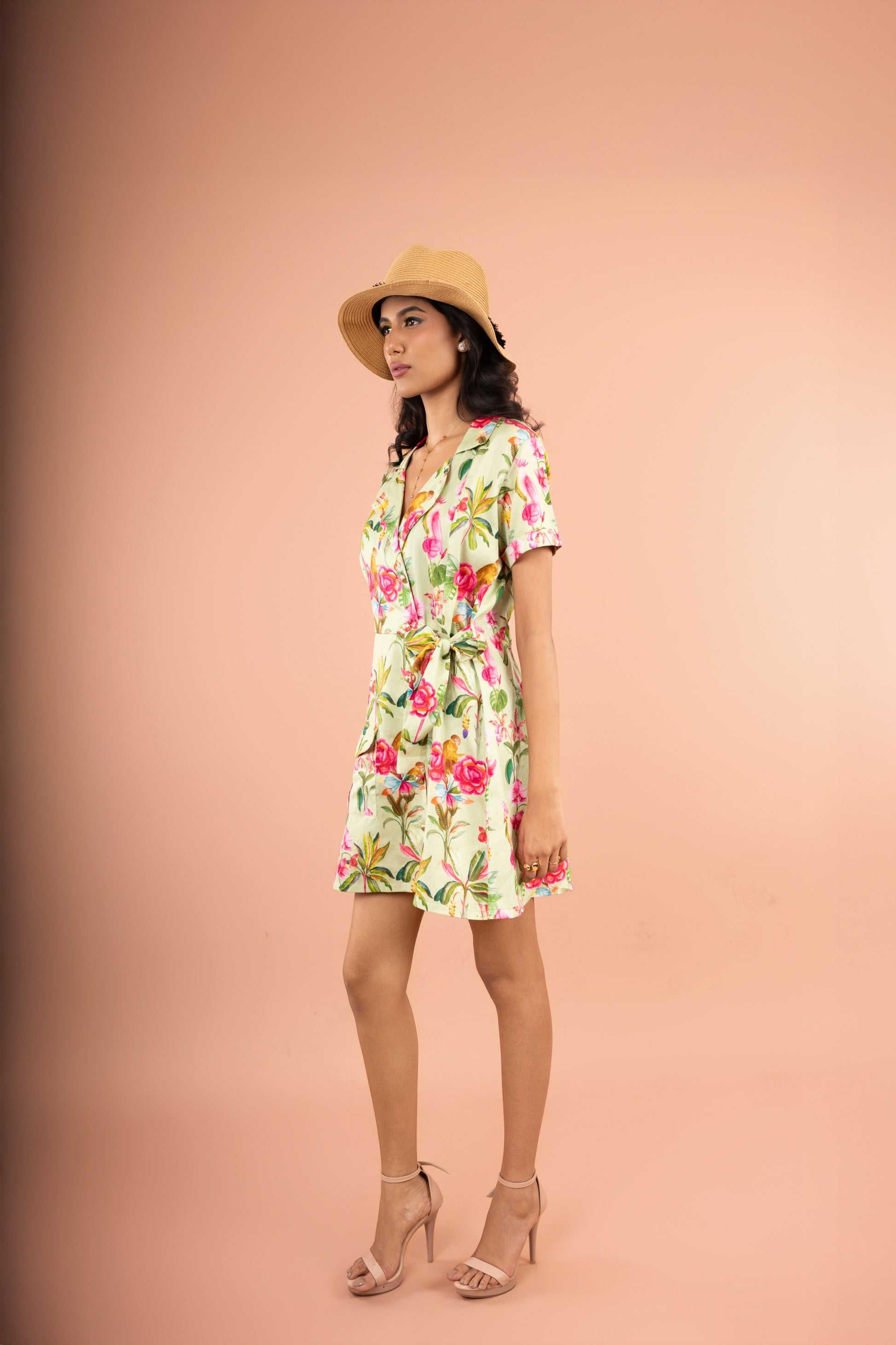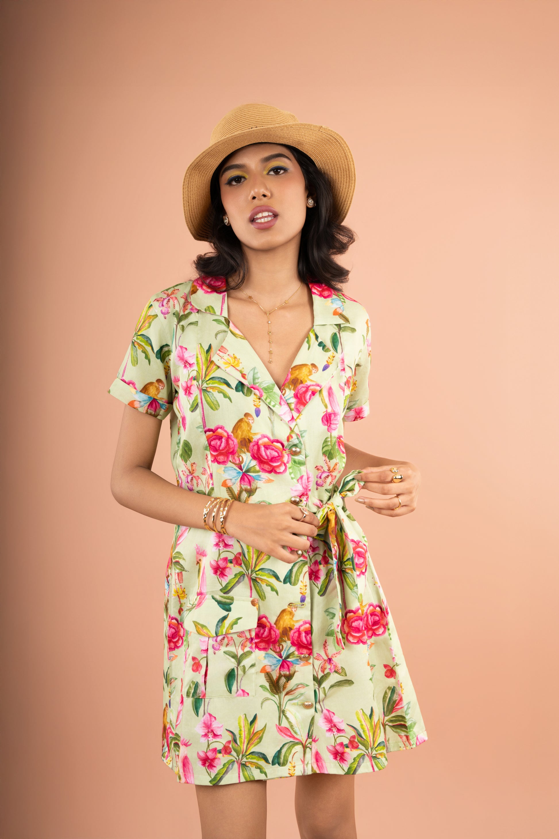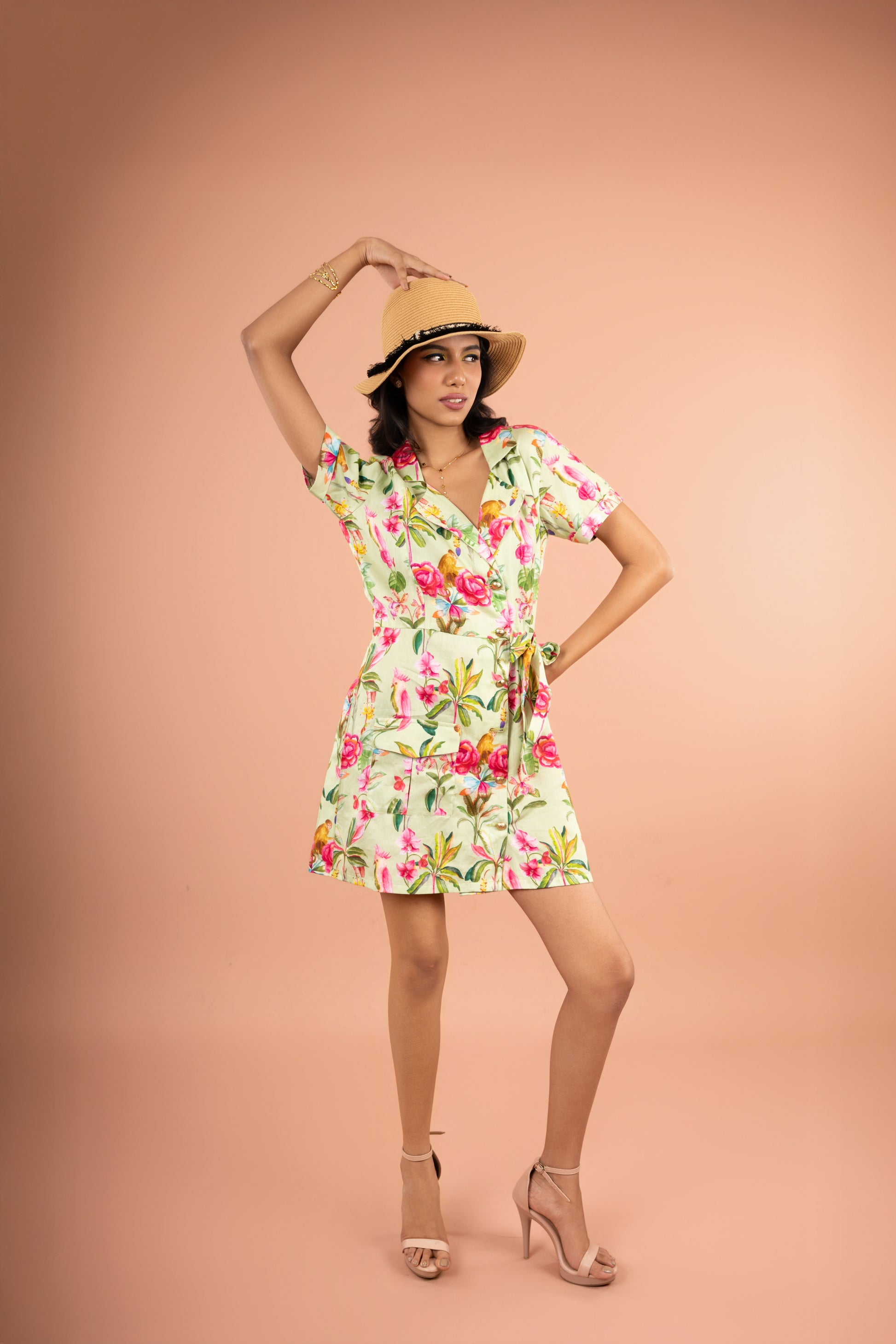 A chic floral wrap dress with a tie-up waist, soft pastel base, and vibrant tropical prints—perfect for brunches, vacations, and sunny day outings.
