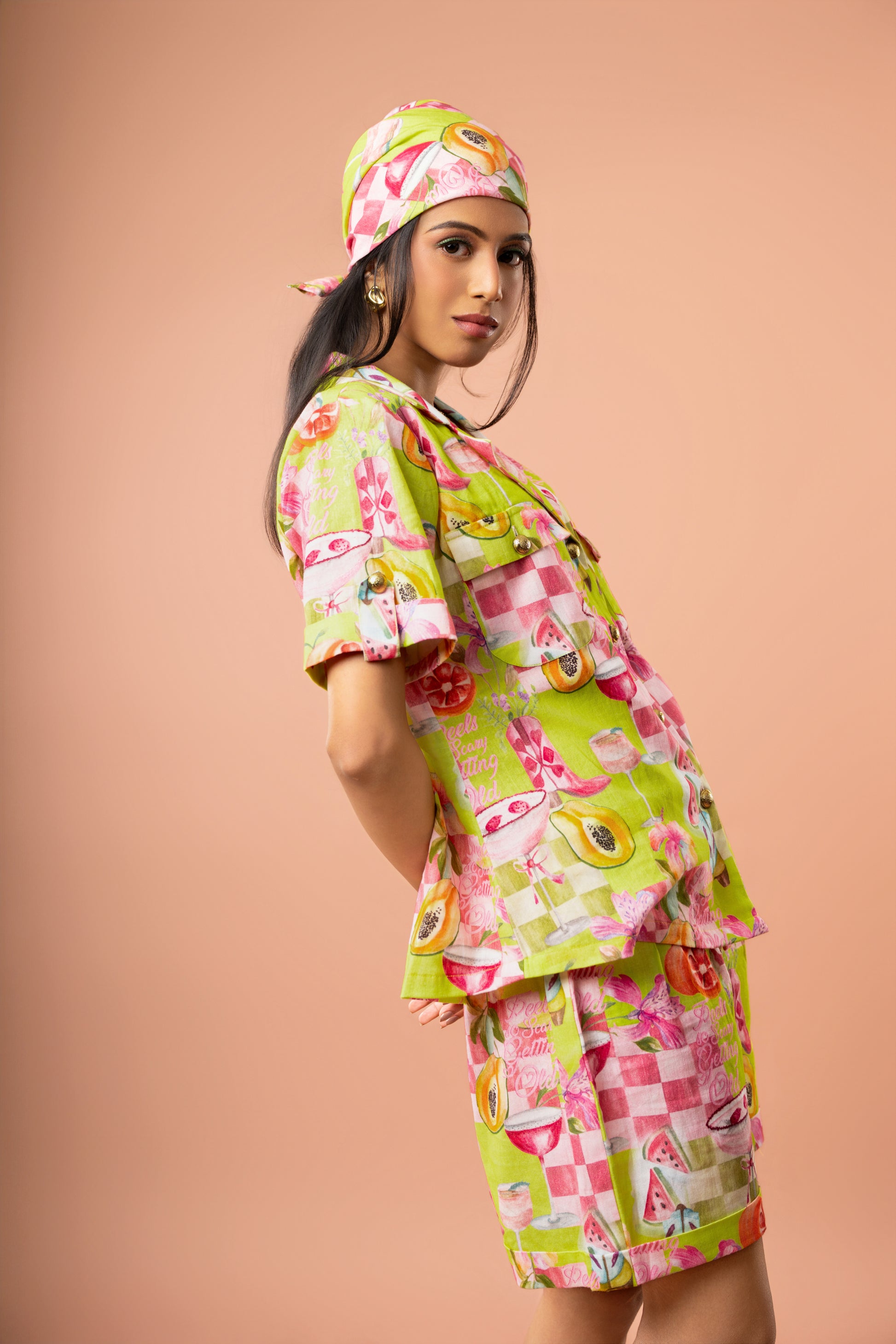 Bright, breezy, and bold — this linen coord set is your shortcut to comfort and style. Featuring a front-open shirt with golden buttons and utility pockets, paired with relaxed-fit shorts. It’s the ultimate no-brainer look that adds an instant pop of colour!