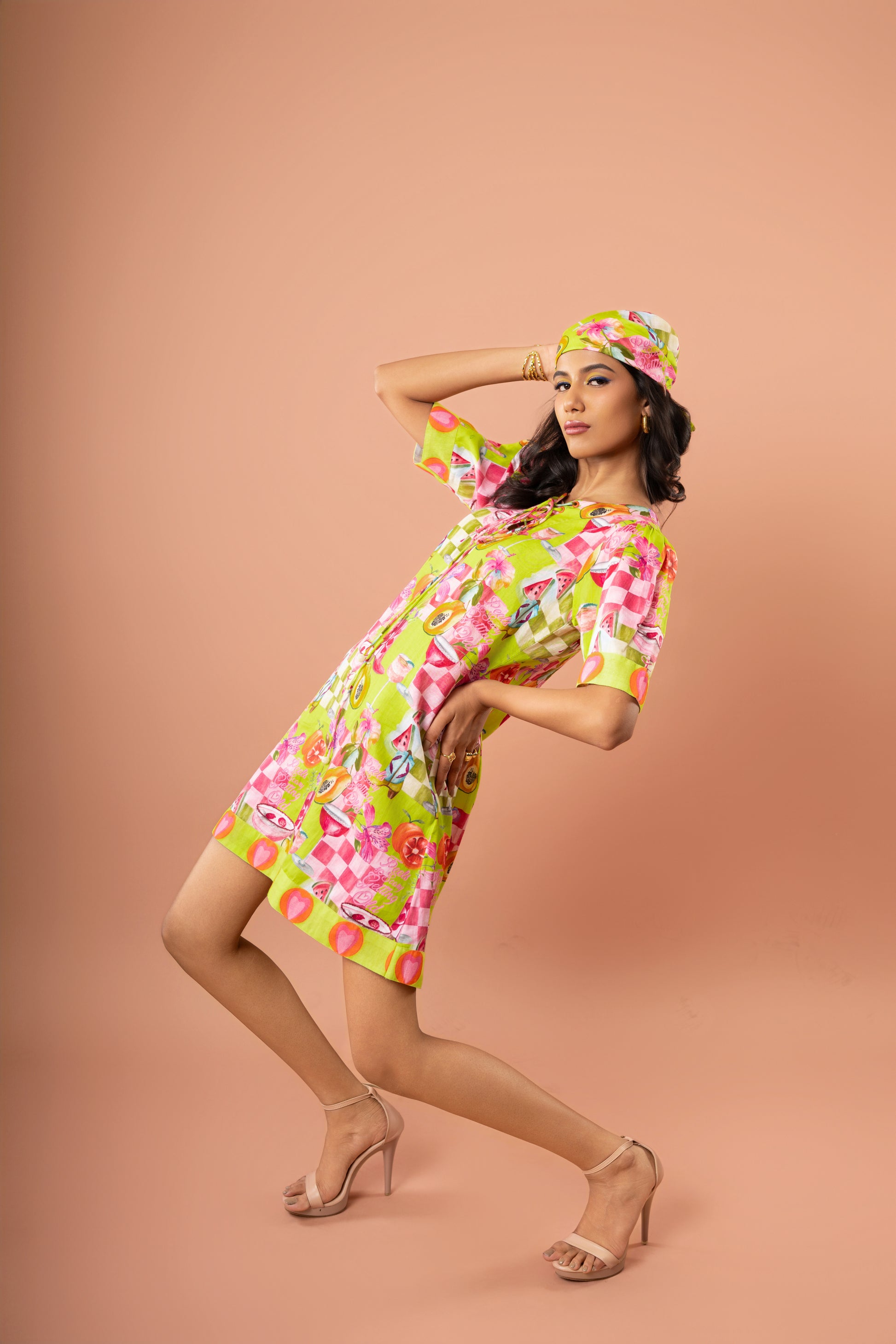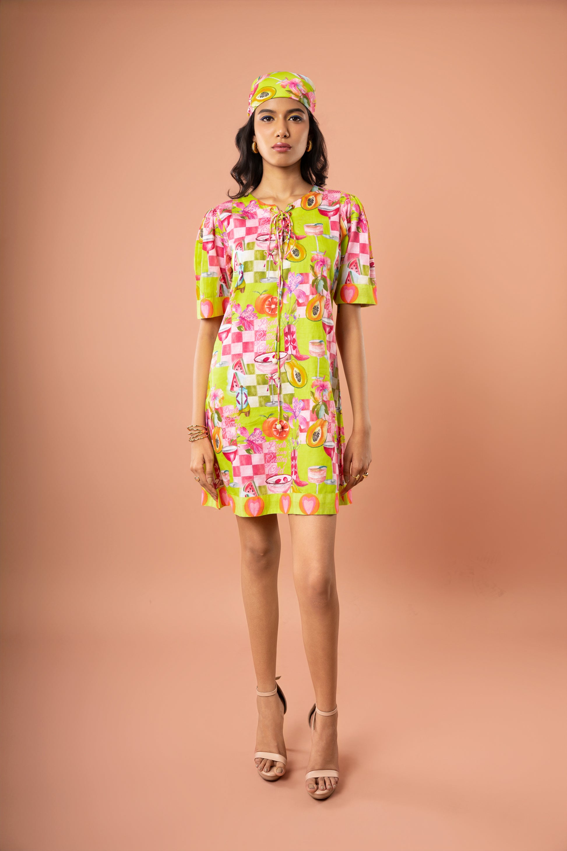 A bold blend of comfort and statement style, this A-line silhouette dress is crafted in soft cotton satin that feels as good as it looks. The eye-catching print is elevated with quirky heart borders, while the rivet tie-up detail in front adds a playful edge. Designed to be effortlessly stylish and easy to wear.
