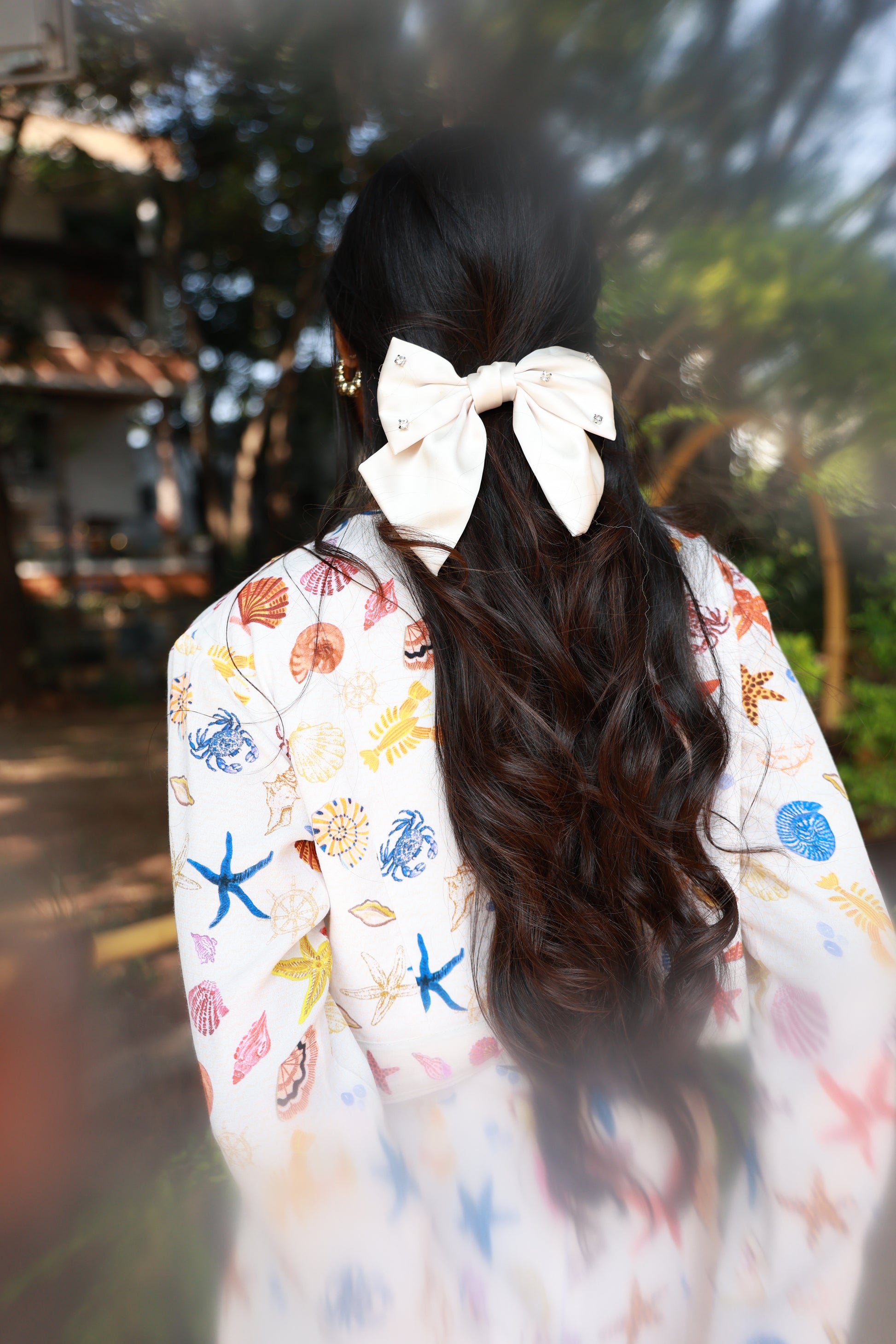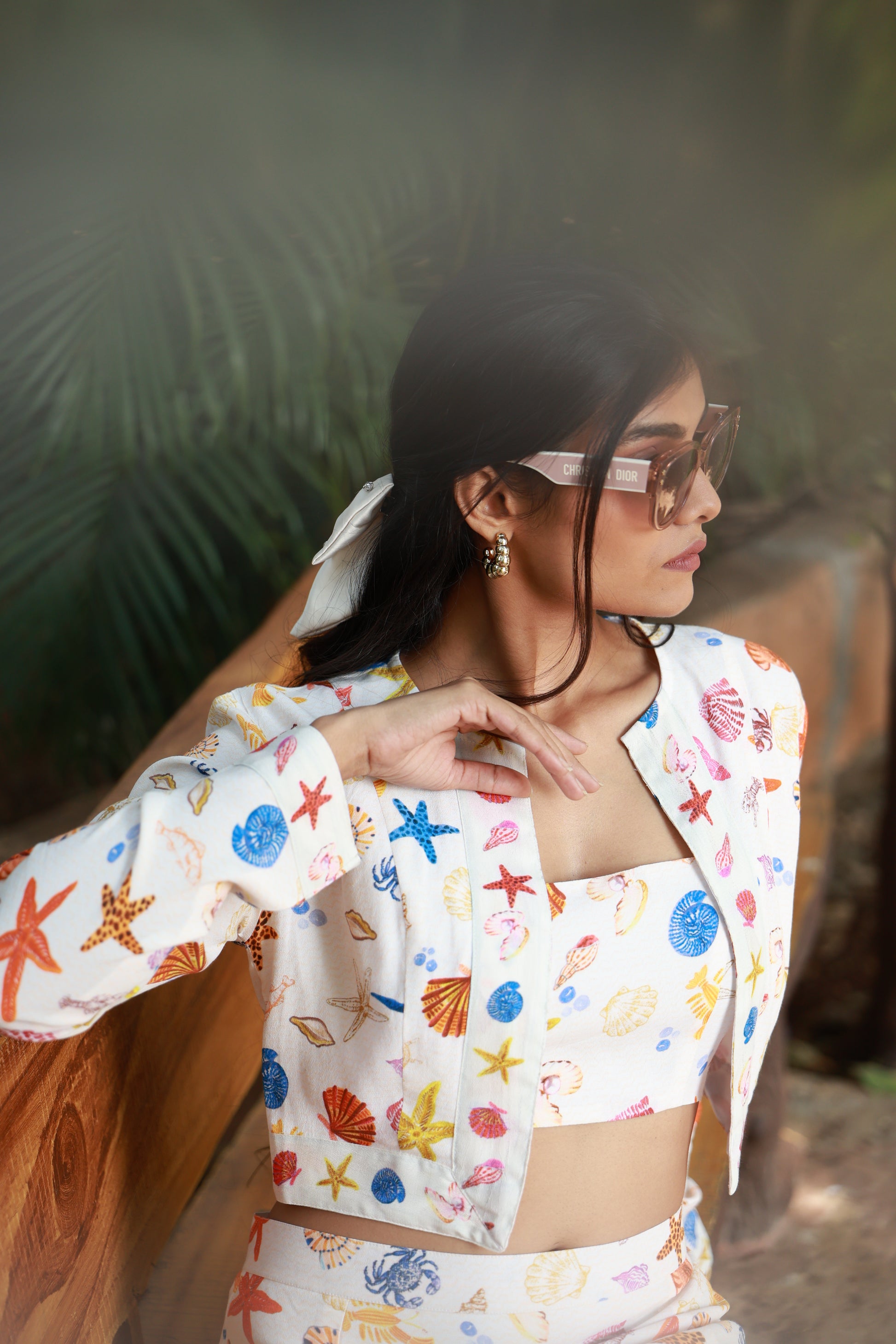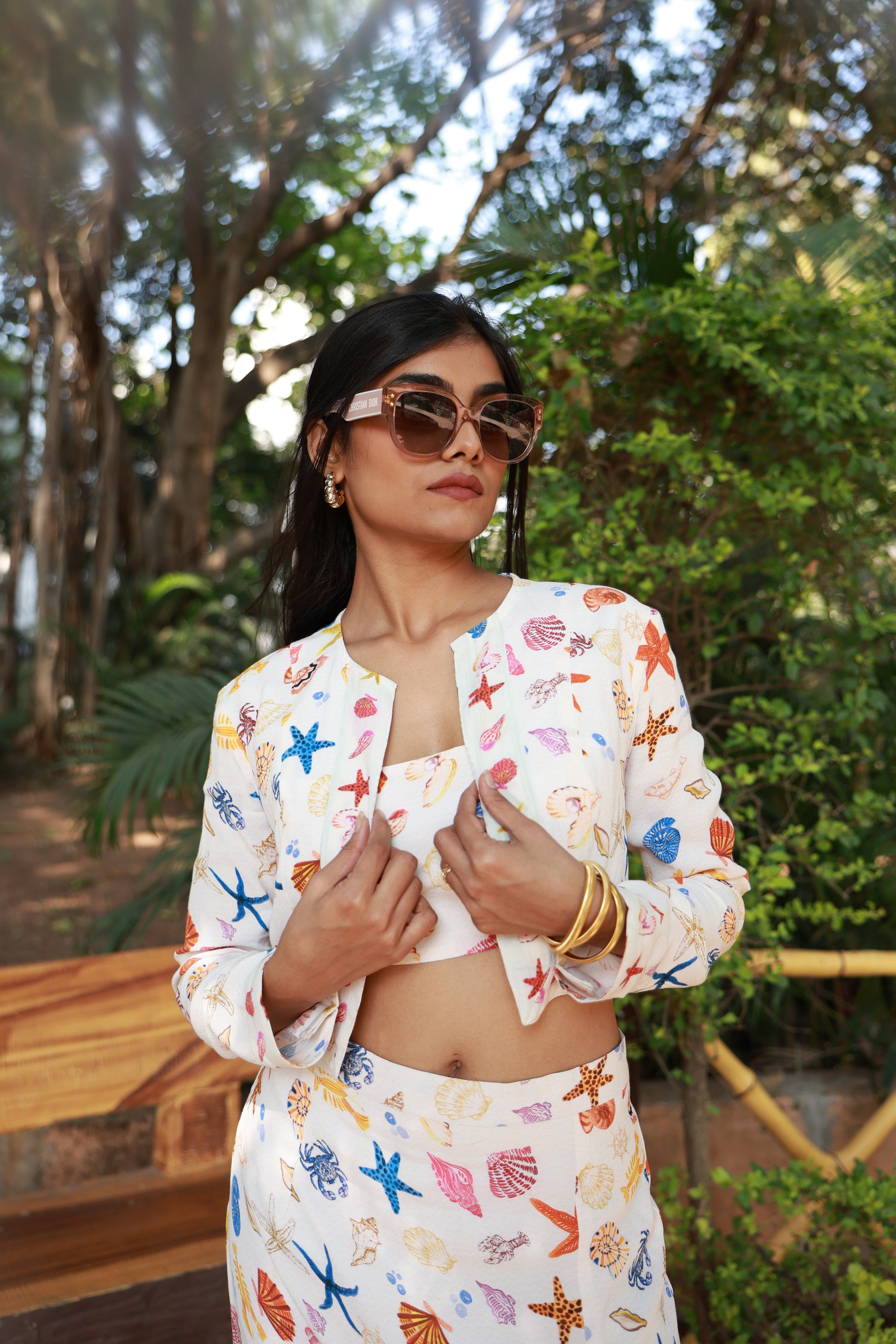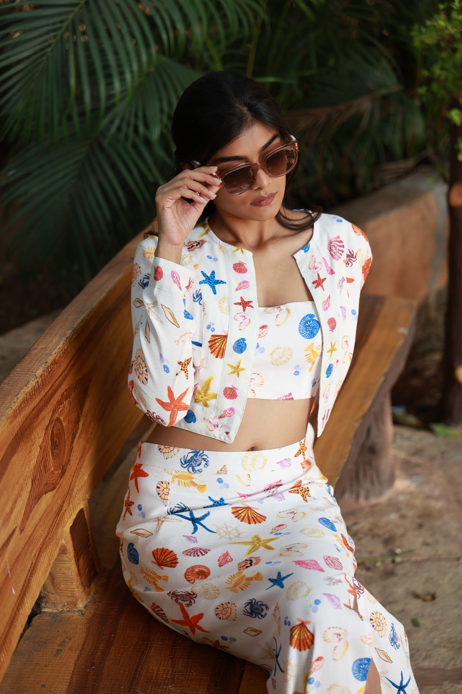 A vibrant cotton twill coord set with jacket featuring a playful mix of shells, starfish, and ocean motifs. Structured yet comfortable, with a flattering silhouette that brings an effortless coastal charm to any outing.